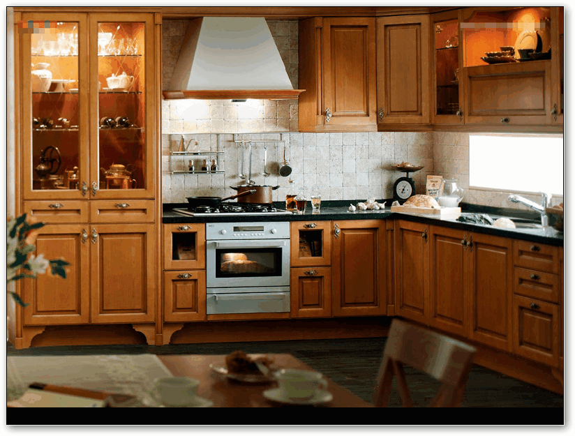 Классическая мебель для кухни изготавливается из натурального дерева, хотя в рамках современной классики допускается использование шпона. При изготовлении мебели активно используются вставки из закаленного стекла. Предпочтение отдается простым геометрическим формам.